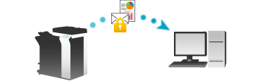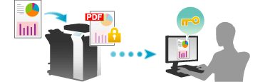 You can restrict file viewing with a password or assign operation privileges to a file when distributing original data as a PDF file. Also, you can add a digital signature using the certificate of the MFP. Encrypting a file prevents unauthorized viewing by third parties. Furthermore, adding a digital signature provides assurance regarding the authenticity of a file author (MFP) and ensures that the file has not been falsified.