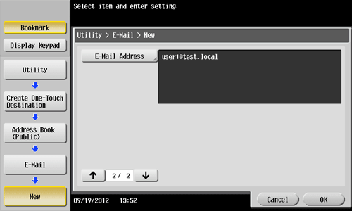 1. Tap [Utility] - [One-Touch/User Box Registration] - [Create One-Touch Destination] - [Address Book (Public)] - [E-Mail] - [New].