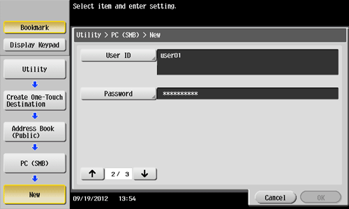 1. Tap [Utility] - [One-Touch/User Box Registration] - [Create One-Touch Destination] - [Address Book (Public)] - [PC (SMB)] - [New].