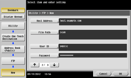 1. Tap [Utility] - [One-Touch/User Box Registration] - [Create One-Touch Destination] - [Address Book (Public)] - [FTP] - [New].