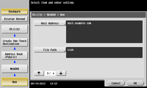1. Tap [Utility] - [One-Touch/User Box Registration] - [Create One-Touch Destination] - [Address Book (Public)] - [WebDAV] - [New].