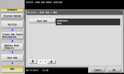 1. Tap [Utility] - [One-Touch/User Box Registration] - [Create One-Touch Destination] - [Address Book (Public)] - [User Box] - [New].