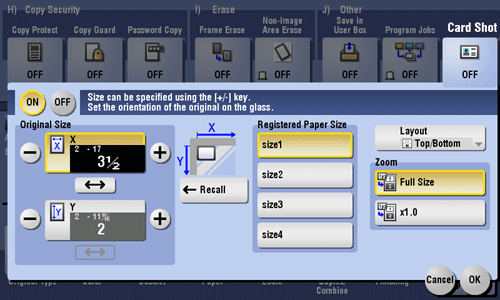 Select [Application] - [Other] to set [Card Shot] to [ON], and configure the [Original Size], [Layout], and [Zoom] settings according to the finishing image.