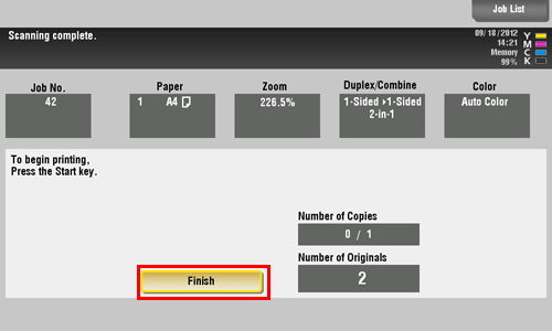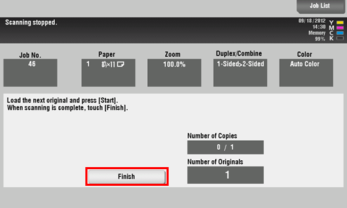 After all originals are scanned, tap [Finish] and press the Start key.