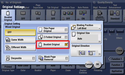 Tap [Application] - [No. of Originals] - [Original Settings], and select [Booklet Original].