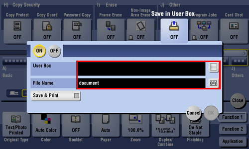 Select [Application] - [Other] to set [Save in User Box] to [ON], and tap the input area or the list icon of the [User Box].