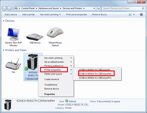 In Windows 7/8/8.1/Server 2008 R2/Server 2012/Server 2012 R2, right-click the icon of the installed printer, and from [Printer properties], click the displayed printer name.