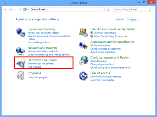 In Windows 8, right-click the Start window, then click [All apps] - [Control Panel] - [Hardware and Sound] - [View devices and printers].