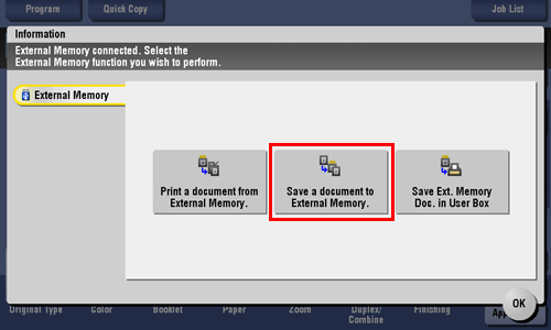 You can also save files by selecting the User Box operation mode and by tapping [System] - [External Memory] - [Save].