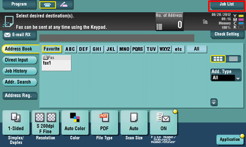 Fax numbers can be specified from [Address Book], [Direct Input], [Job History] or [Program]. For details on how to specify a destination, refer to Here. For details on how to specify a fax/scan program, refer to Here.