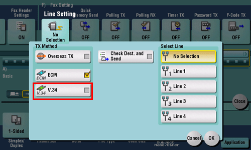 By default, this machine transmits faxes with V34. You can send faxes with V34 canceled if it is not possible to establish a communication in the Super G3 mode depending on telephone line conditions (for example, when the remote or this machine is connected to a PBX line).