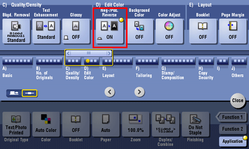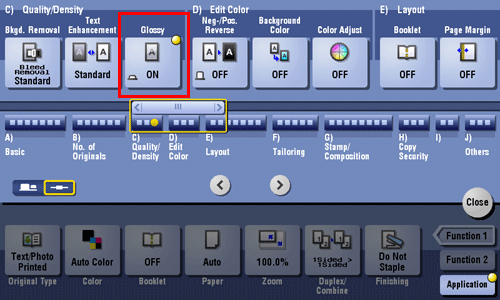 [Recall Image Adjustment Program] | Call the image quality adjustment program. The registered content of a program is applied. For image adjustment program, you can register the settings of [Original Type], [Density], [Bkgd. Removal], [Text Enhancement], [Neg-/Pos. Reverse], [Background Color], [Color Adjust], and [Mirror Image]. For details on how to register, refer to Here. |