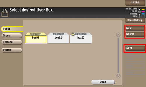 Tap [Utility] - [One-Touch/User Box Registration] - [Create User Box] - [Public/Personal User Box] - [New].