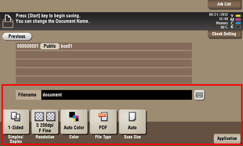 This example uses the Public User Box for explanatory purposes. To use a Personal User Box or a Group User Box, tap [Personal] or [Group] and select the desired box.