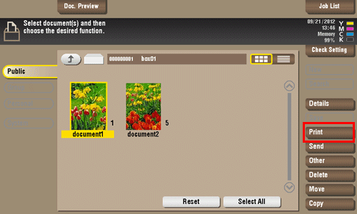 [Change order] | This option is displayed when multiple files are selected. You can change the file storage sequence if necessary. Select files and change their print sequence by clicking [Top]/[Up]/[Down]/[Bottom]/[Undo]. To display files as thumbnails, click [Thumbnail View]. |