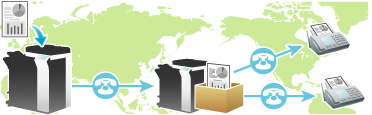 Relay Distribution distributes a received fax to pre-registered destinations after it has been sent to the relay station. Grouping relay stations and destinations by region offers the lower total communication cost than broadcasting to all destinations. This function is available when broadcasting faxes to distant locations.